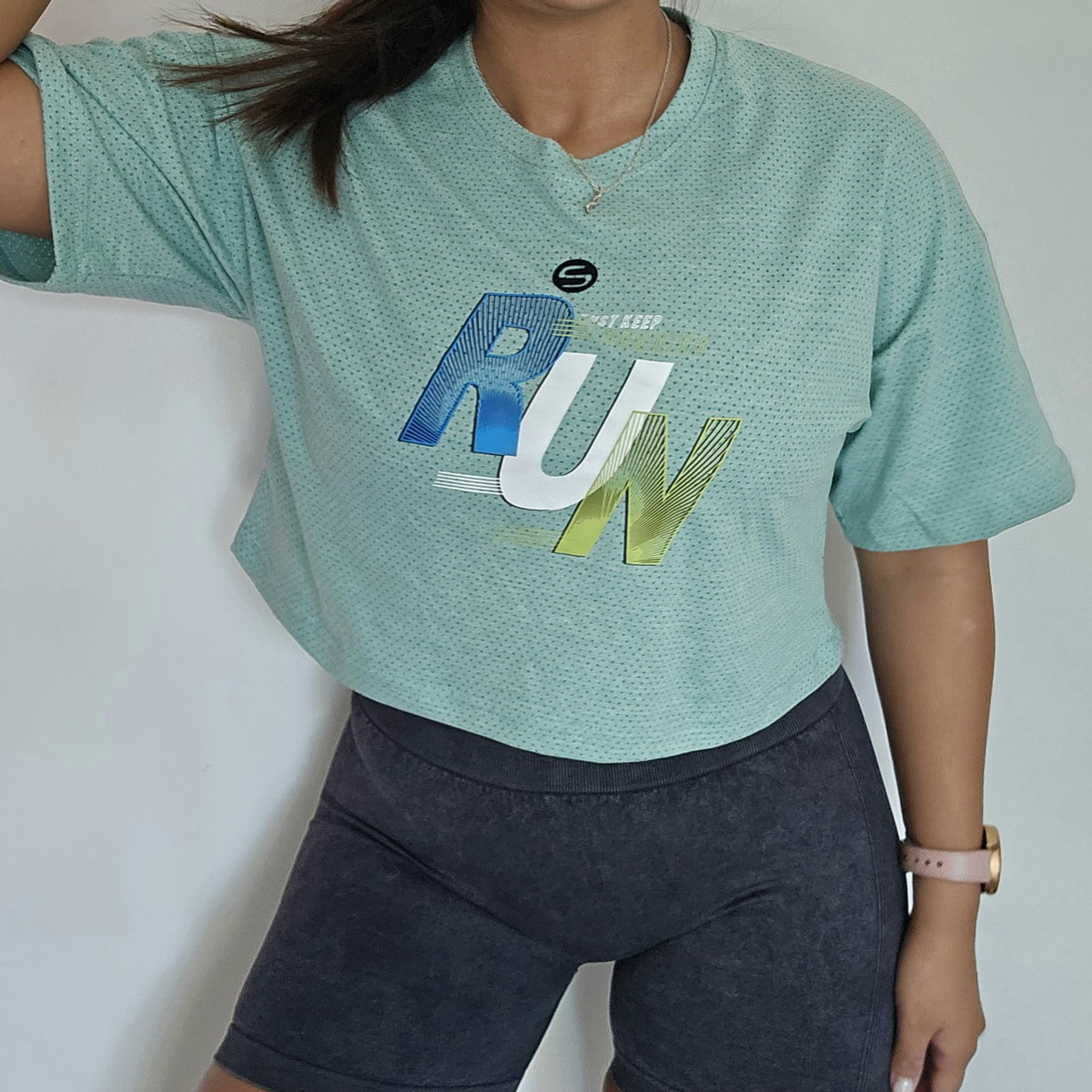 Remera a la cadera de dryfit deportivo, con un corte suelto que no ajusta al cuerpo.